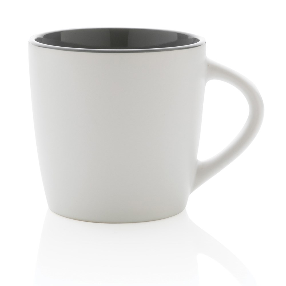 Deze keramische mok heeft een fris design met een matte afwerking aan de buitenkant en een kleuraccent aan de binnenkant. De mok is vaatwasmachinebestendig en getest volgens EN12875-1 (minstens 125 wasbeurten voor alle decoratiemethodes). Verpakt in een kraft geschenkdoos. Capaciteit 300ml.