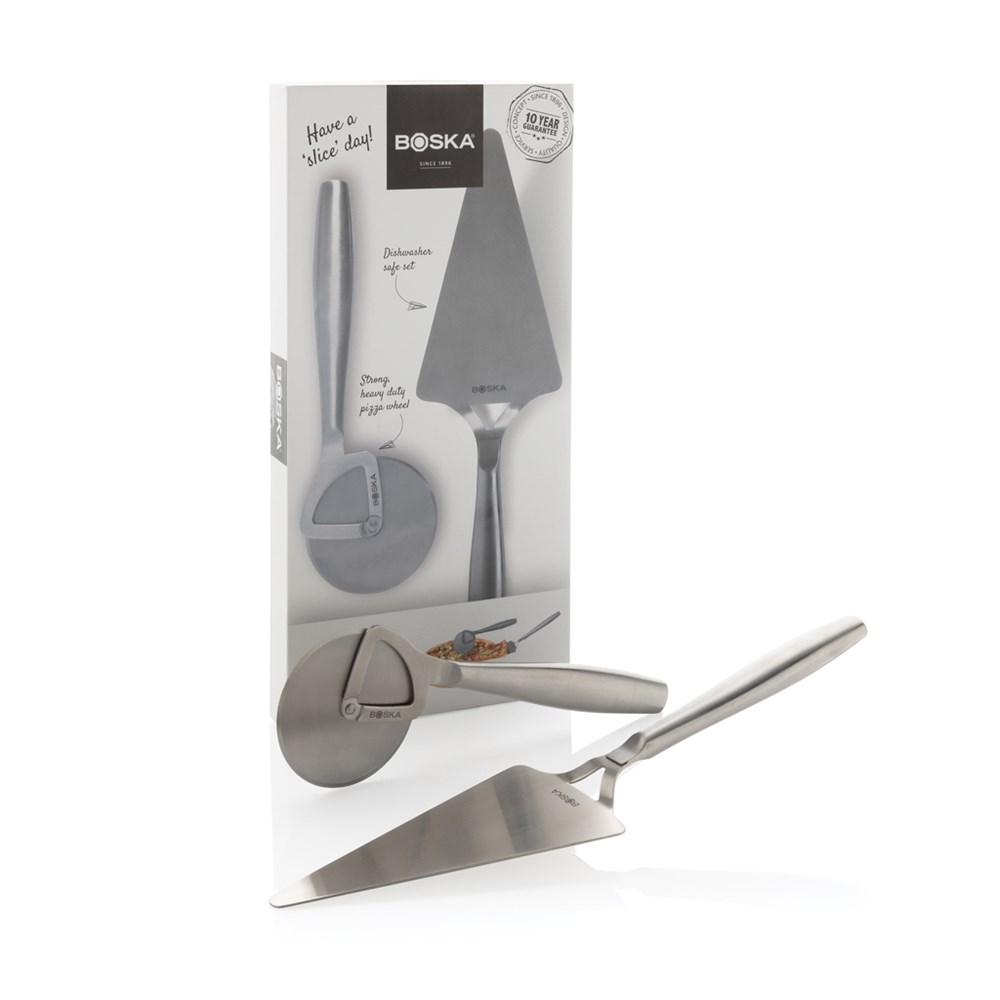 Snijd en serveer je favoriete pizza in stijl met de Pizzaset Copenhagen van het merk Boska – een B Corporation gecertificeerd bedrijf. Deze vaatwasser- en koelkastbestendige set bevat een lichtgewicht pizzasnijder en spatel, beide gemaakt van hoogwaardig roestvrijstaal. De set is niet alleen perfect voor pizza, maar ook voor andere lekkernijen zoals flammkuchen en taart. Bovendien wordt het geleverd met een levenslange garantie.