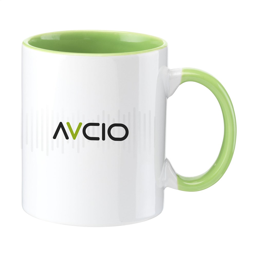Hoogwaardig keramische mok met gekleurde binnenzijde. De kleur van het royale oor matcht met de kleur van de binnenzijde en dat geeft een speels effect. De perfecte mok voor alle full colour bedrukkingen, ook foto’s. Vaatwasserbestendig. Inhoud 350 ml.