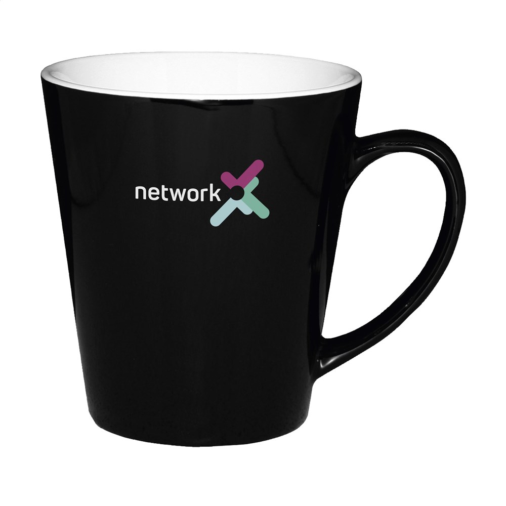 Eigentijdse keramische kwaliteitsmok. In geheel wit óf met gekleurde buitenzijde. Inhoud 310 ml. vaatwasserbestendig. De opdruk is vaatwasmachine getest en gecertificeerd: EN 12875-2.
