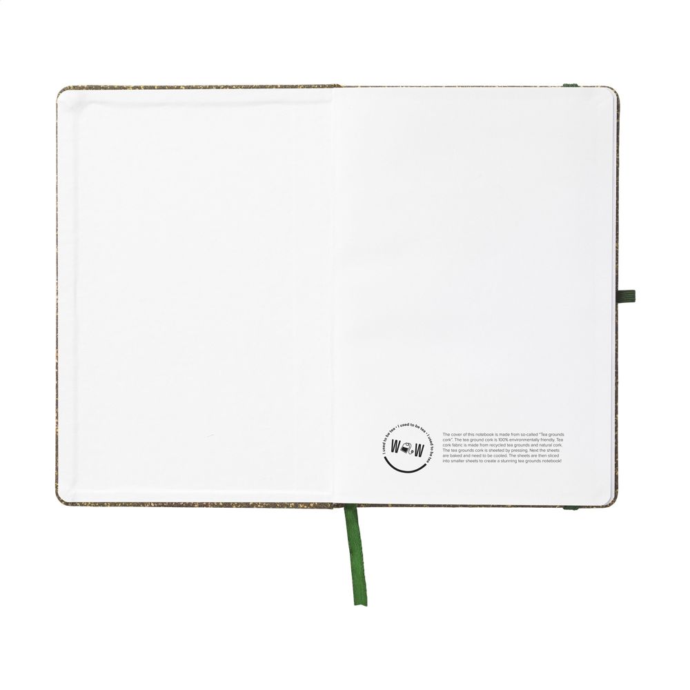Notitieboek in A5-formaat. De stevige FSC gecertificeerde kartonnen cover is bekleed met een mix van theebladerenafval, kurk, polyester en katoen. Het resultaat is een stoere cover in diverse groen-/bruintinten met een natuurlijke uitstraling. Het notitieboek heeft ca. 96 vel/192 pagina's wit, gelinieerd, gerecycled FSC Mix gecertificeerd papier (70 g/m²). Met penlus, sluitelastiek en leeslint. Door gebruikte theeblaadjes als basis te gebruiken voor de productie van nieuwe materialen, zoals deze cover, wordt de levenscyclus van theeblaadjes verlengd. Door het gebruik van organische materialen kan de kleur van de cover per notitieboek/batch enigszins afwijken. Ter info: Door de grove structuur van de cover is het bedrukken van kleine details in een logo, dunne lijnen en kleine letters beperkt. Het kan daarom voorkomen dat we je, na ontvangst van je logo, adviseren het logo aan te passen of te vergroten.