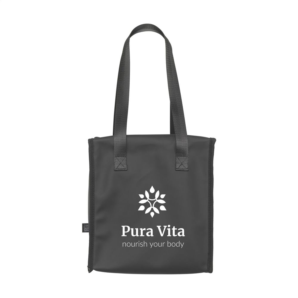 Stevige en stoere koeltas gemaakt van waterafstotend PU, 7% gerecycled PU en 15% gerecycled polyester. Het materiaal kan tegen een stootje en is bovendien gemakkelijk schoon te houden. De binnenzijde van de tas is bekleed met aluminiumfolie voor het koelhouden van de inhoud. De koeltas heeft een ritssluiting en twee stevige handgrepen. Aan de voorzijde zit een extra opbergvak - handig voor je telefoon, portemonnee of iets anders dat niet koel bewaard hoeft te worden. RCS-gecertificeerd. Totaal gerecycled materiaal: 22%. Inhoud ca. 9 liter.