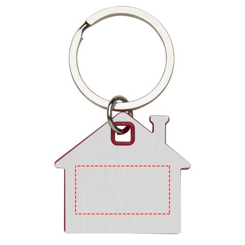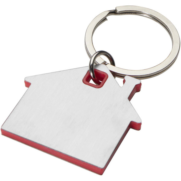 Sleutelhanger in de vorm van een huis, met een roestvrijstalen plaatje met een mat design aan de voor- en achterkant en een gekleurde plastic chip in het midden.