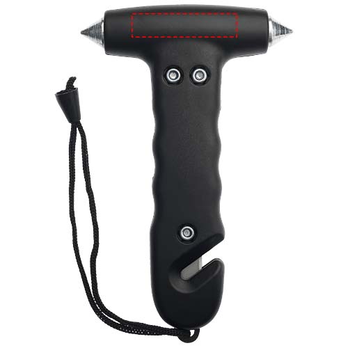 Noodhamer met polsband en geïntegreerde gordelsnijder in het handvat. Twee stalen ruitbrekers met geharde punt en gordelsnijder kunnen worden gebruikt om te ontsnappen in geval van problemen.