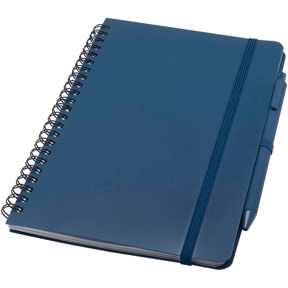 Het Thalaasa A5 notitieboek met harde kaft is gemaakt van ocean-bound plastic en heeft 80 gelinieerde vellen crèmekleurig papier van 70 g/m². Het notitieboek heeft afgeronde hoeken, een elastische sluiting en een pennenlus. De balpen met zwarte inkt is ook gemaakt van gerecycled plastic uit de oceaan. Schrijflengte: 1000 meter. Stiftmaat: 1,0 mm.