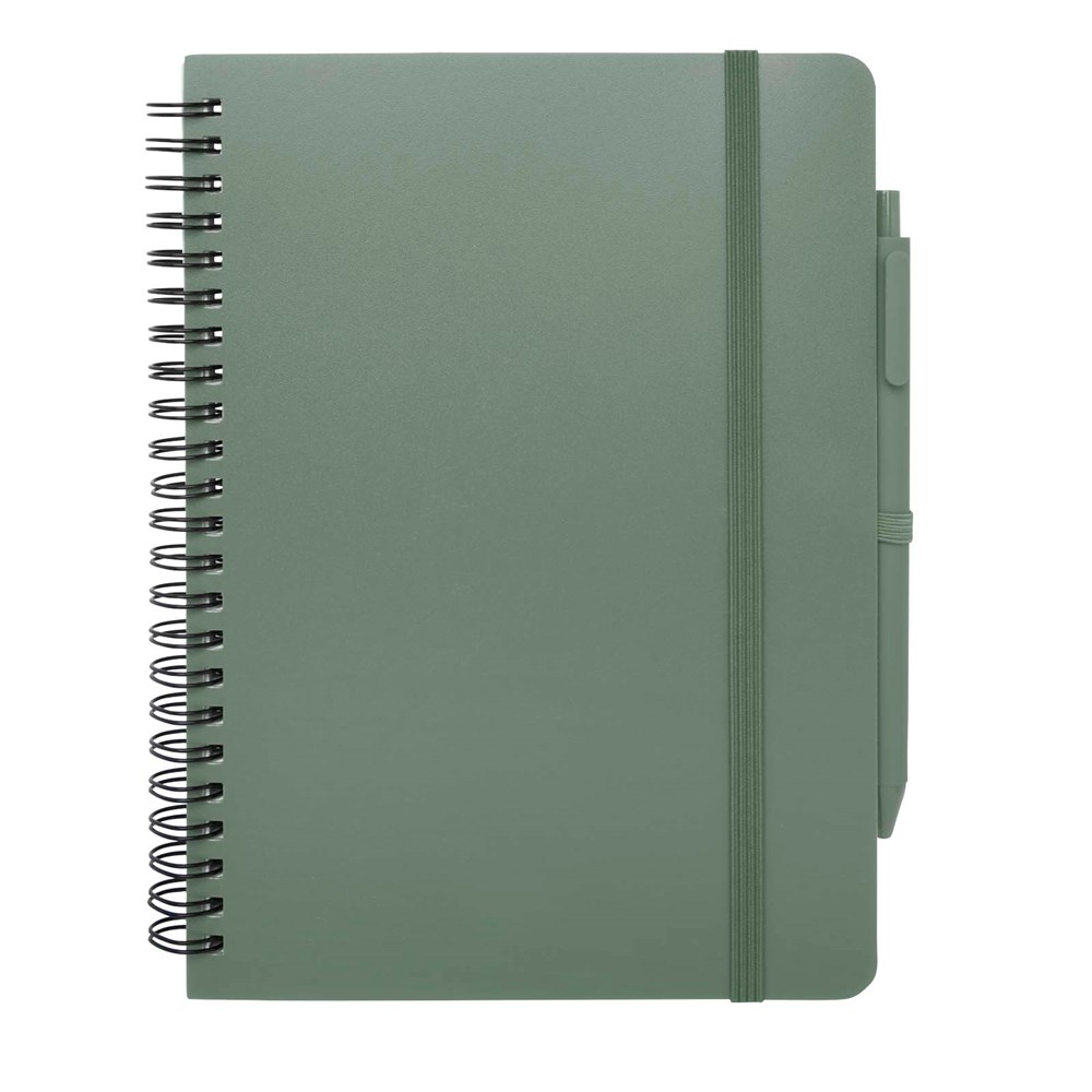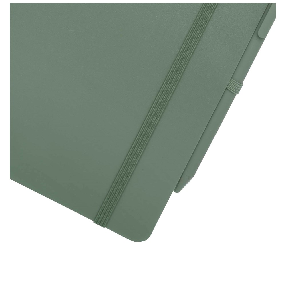 Het Thalaasa A5 notitieboek met harde kaft is gemaakt van ocean-bound plastic en heeft 80 gelinieerde vellen crèmekleurig papier van 70 g/m². Het notitieboek heeft afgeronde hoeken, een elastische sluiting en een pennenlus. De balpen met zwarte inkt is ook gemaakt van gerecycled plastic uit de oceaan. Schrijflengte: 1000 meter. Stiftmaat: 1,0 mm.