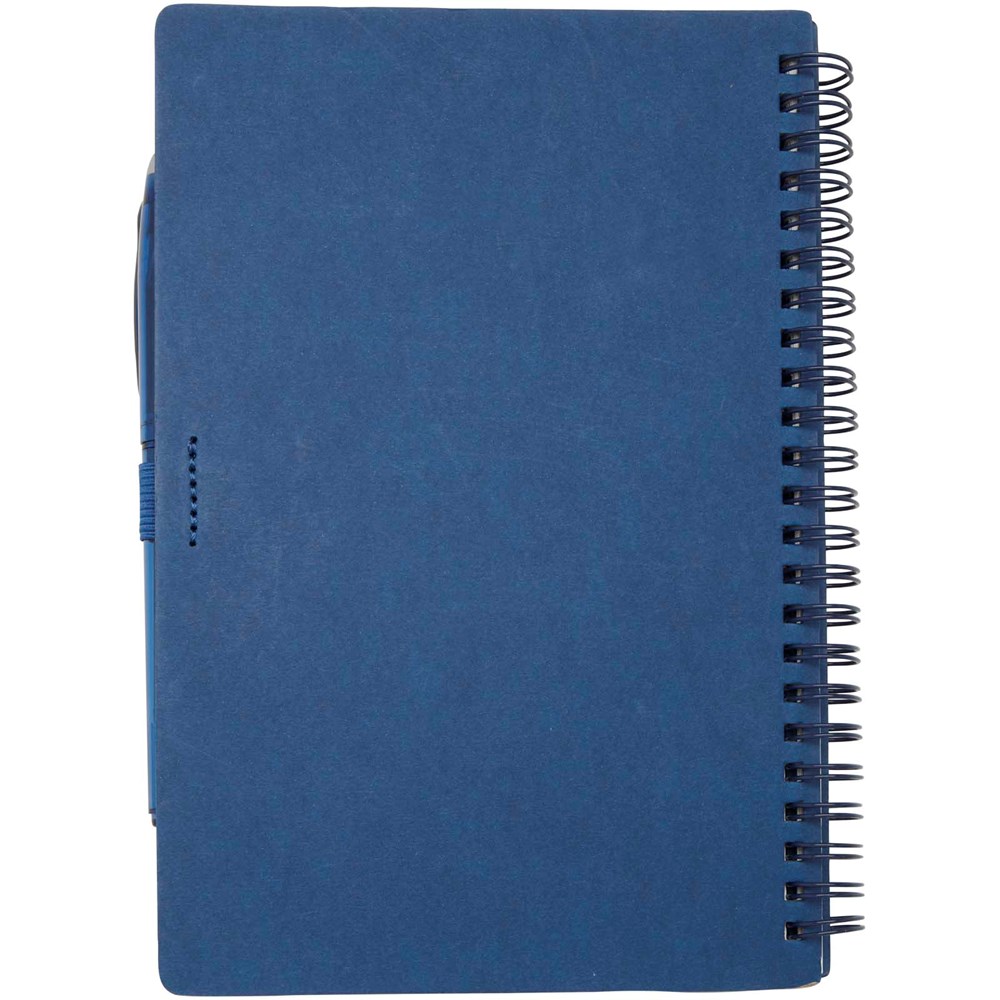 Herbruikbaar A5 notitieboek met steenpapier, harde kaft en pennenset. Het notitieboek heeft een kaft van karton, afgeronde hoeken en 32 vellen gelinieerd papier van 120 g/m². Steenpapier is 100% boomvrij en het productieproces verbruikt minder energie in vergelijking met gerecycled of nieuw pulppapier. Aan de achterkant zit een vakje om een zwart poetsdoekje in op te bergen (meegeleverd). Uitwisbare pen van gerecycled plastic met een transparante houder, witte gum bovenop en een effen gekleurde grip. Inktkleur: zwart. Schrijflengte: 250 meter. Stiftmaat: 0,7 mm.