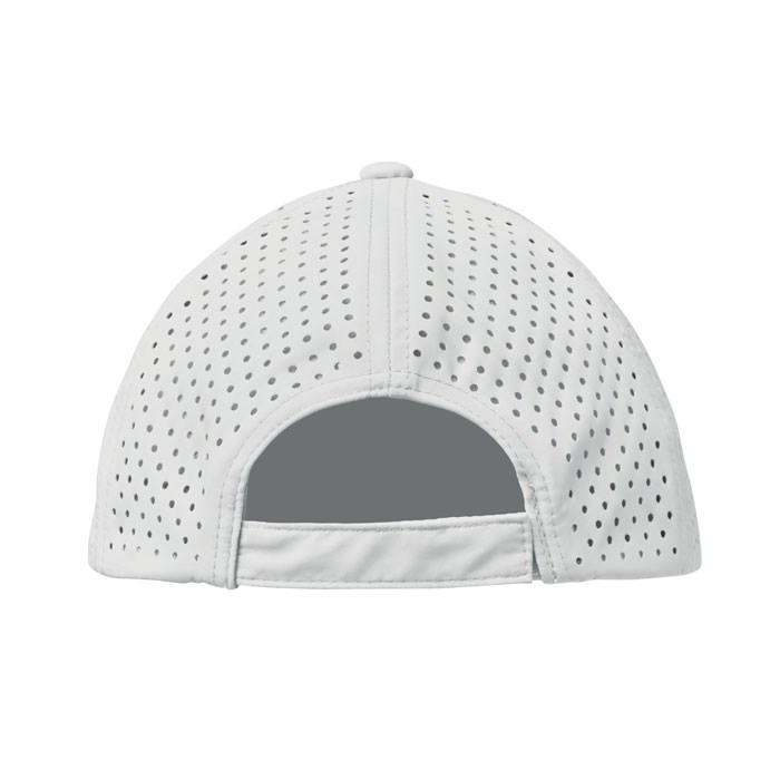 Polyester baseballpet met verstelbare klittenbandsluiting en lasergeperforeerde gaten met 2 geborduurde oogjes in bijpassende kleur. 5 panelen. Het item is sneldrogend, zweet- en waterafstotend. 130 gr/m²
