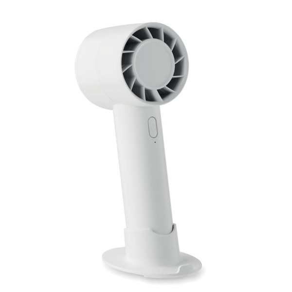Kleine draagbare ventilator inclusief bureaustandaard met mogelijkheid voor telefoonhouder. 3 snelheidsstanden. Oplaadbare batterij 2000 mAh via USB-poort.