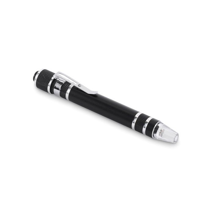 Gerecycled aluminium multitool in penvorm met zaklamp. Inclusief 3 sleuf- en 3 kruiskopschroevendraaiers. inclusief 4 knoopcel LR41 batterijen.