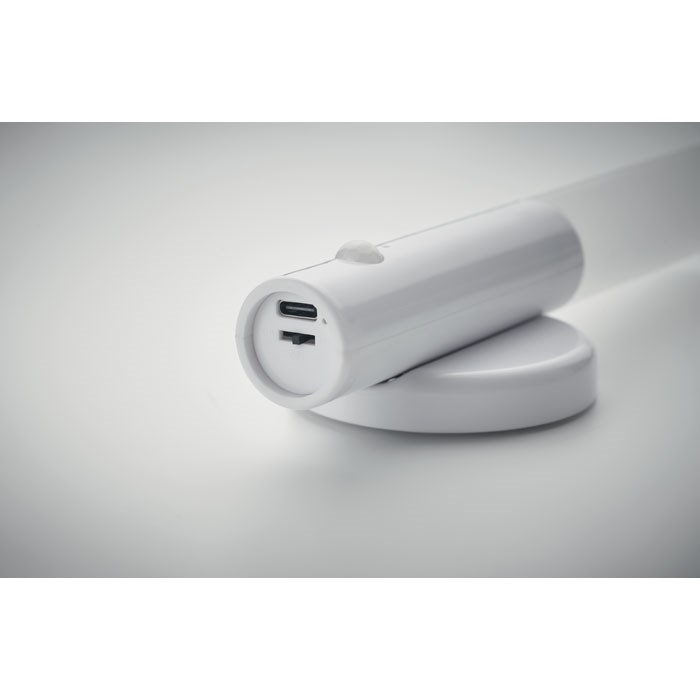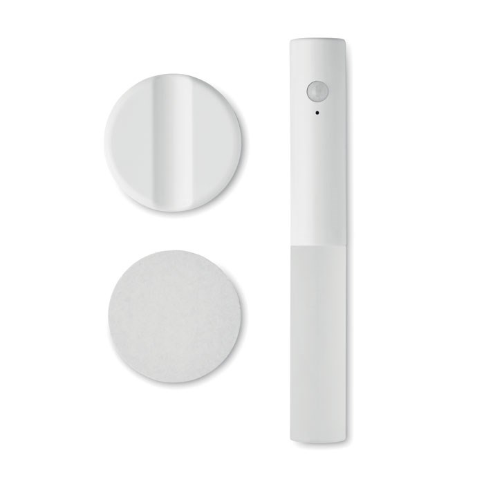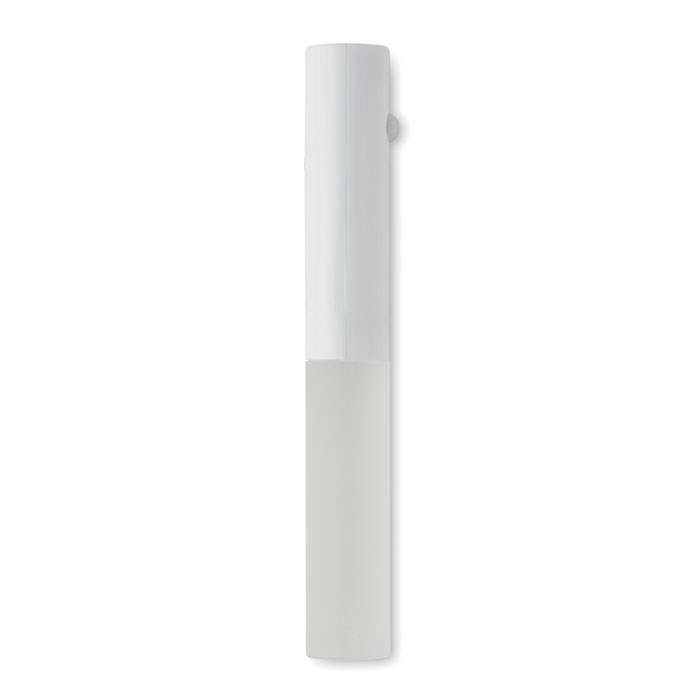Nood- en sensor zaklamp in ABS en acryl met magnetische basis. Ingebouwde 300 mAh oplaadbare batterij en oplaadkabel. De basis kan met de meegeleverde 3M-sticker aan de muur worden bevestigd.