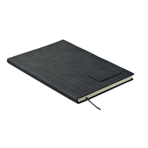 A5 notitieboek met zachte smokey PU geribbelde kaft van 40% gerecycled post consumer en 60% PU met effen PU patch. 160 gelinieerde pagina's van 70 grams gerecycled papier (80 vellen). Bijpassende kleur bladwijzer met polyester lint.