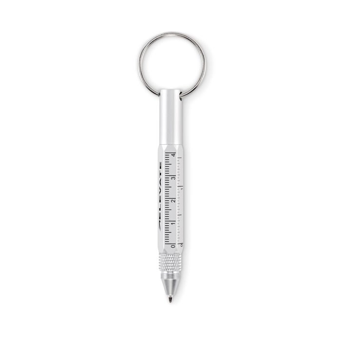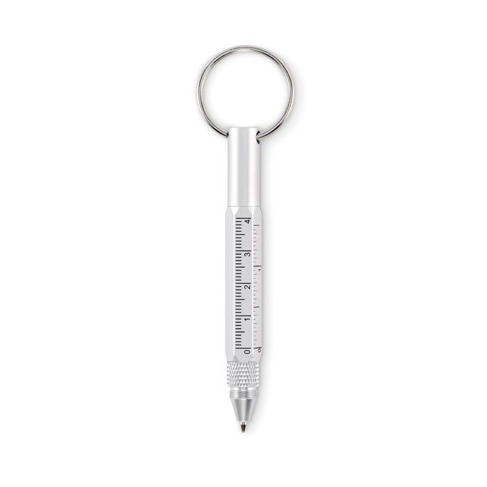 Sleutelhanger met draaipen van gerecycled aluminium, inclusief een liniaal van 4 cm en 1,5 inch, een stylus en een 2-in-1 kruiskop- en platkopschroevendraaier. Zwarte inkt.