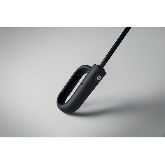 Opvouwbare 21'' windproof paraplu met volledig zwart geplatteerd fiberglas frame met 2 secties. Glasvezel baleinen. 190T RPET pongee panelen. D-vormig karabijnhaakhandvat met rubberen afwerking. Automatisch openen en sluiten. Inclusief etui