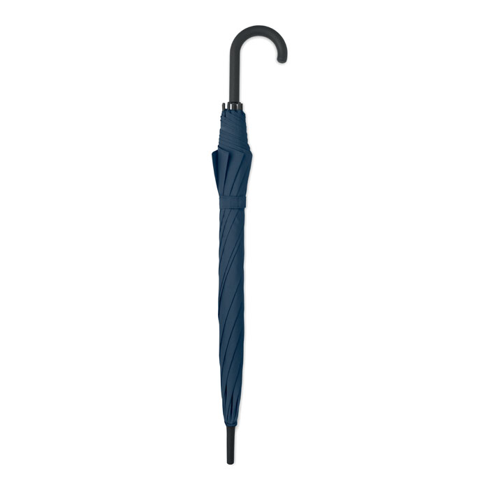 23 inch rechte automatisch openende paraplu met zwart metalen frame, glasvezel baleinen en panelen in 190T pongee stof. Plastic tips en bovenkant. Met rubber bekleed PP plastic gebogen handgreep. Handmatige sluiting.