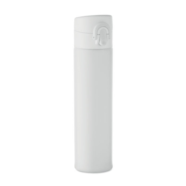 Dubbelwandige drinkfles van gerecycled roestvrij staal (90% gerecycled roestvrij staal en 10% roestvrij staal) met veiligheidsslot op het deksel en optie om te openen met drukknop. Lekvrij. Inhoud: 300ml.