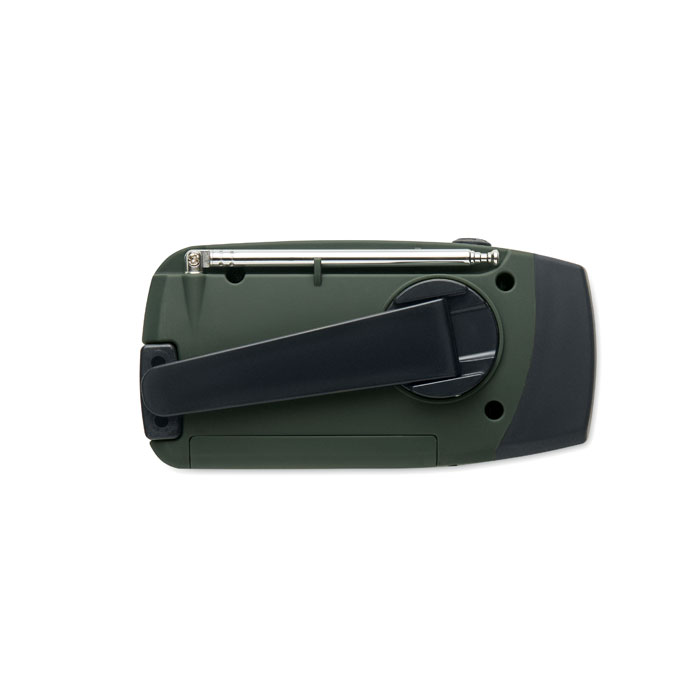 Draagbare AM/FM radio in ABS met LED zaklamp (2 standen) en een 1200mAh Powerbank voor opladen in noodgevallen . Zelfvoorzienend door zonne-energie en handslinger.