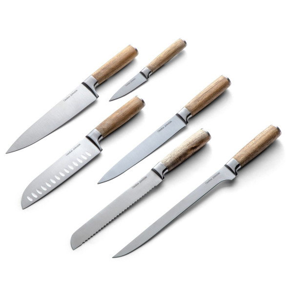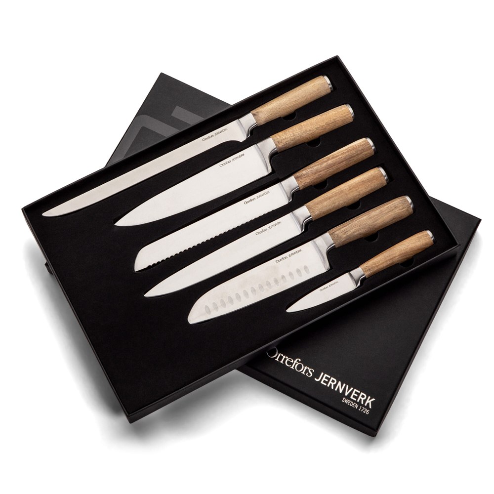 De ultieme set keukenmessen! Een compleet pakket met de hoogwaardige messen van Orrefors Jernverk. Mooi om in de keuken te hebben en perfect om te geven aan degene die alles al heeft. De set bevat keukenmes, schilmes, fileermes, santokumes, broodmes, visfileermes van het fijnste design met acaciahouten handvatten. De set zit in luxe doos verpakt