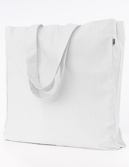 100% Fairtrade-gecertificeerd biologisch katoen | Zware keperbinding | Brede lange handgrepen (L/B ca. 70 cm/4,5 cm) | Oversized: 50 x 50 cm | Brede onder- en zijplooien (10 cm) | Zwaar gramsgewicht: 280 g/m² | Kruiszoom aan de scharnier van de handgreep | Sterke interne verbinding | Fairtrade-zegel zichtbaar aan de buitenkant van de tas | Levering zonder decoratie/inhoud