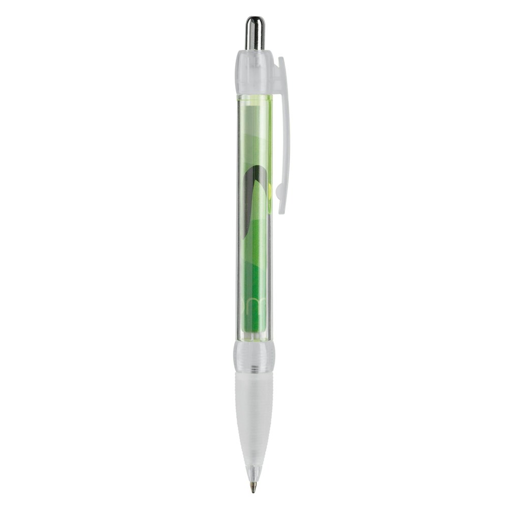 Transparante balpen met rubberen grip. Met full-colour banner bedrukking aan twee zijden. Blauwschrijvende X20 vulling. Bedrukking op de houder of clip mogelijk.