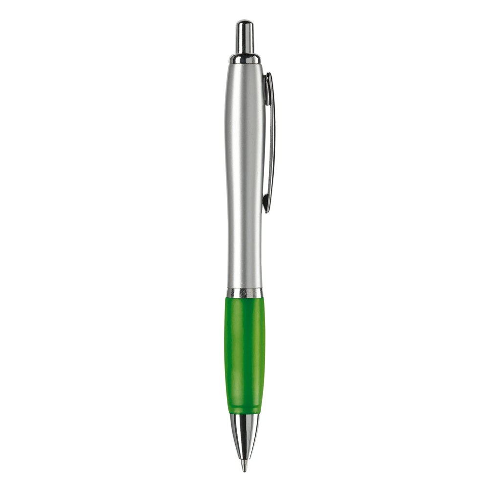 Zilveren balpen met metalen clip, gekleurde grip en een 'metal-look' drukknop, ring en punt. De pen bevat een blauwschrijvende Jumbo vulling.