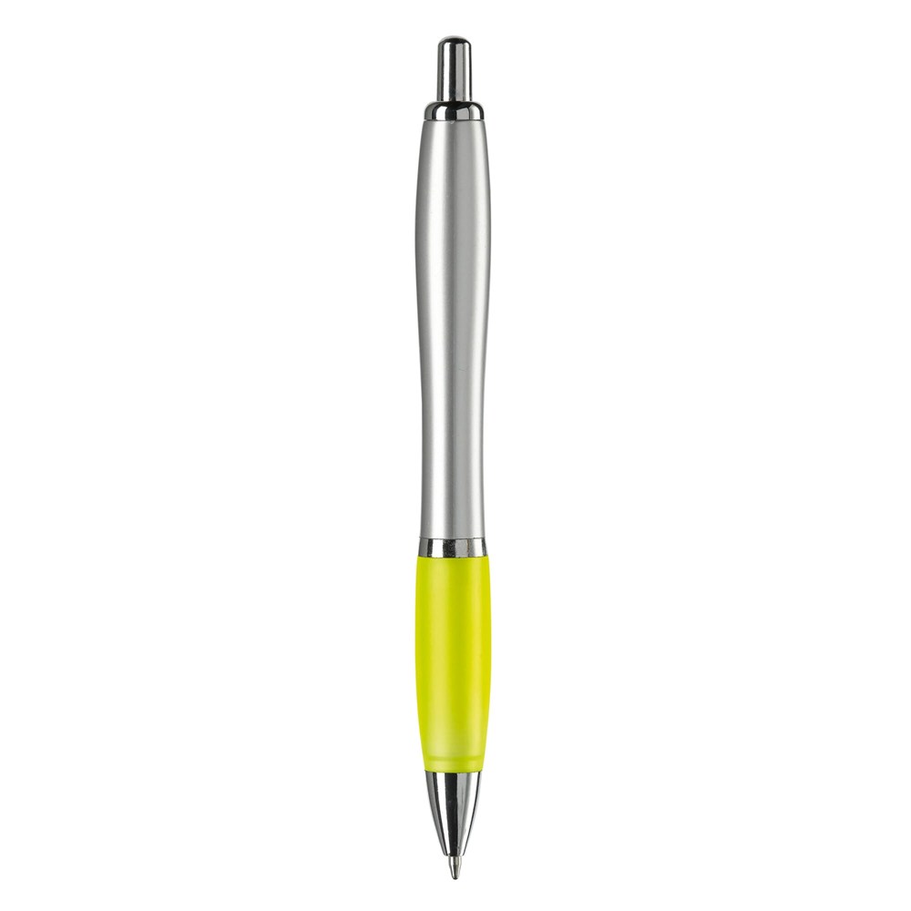 Zilveren balpen met metalen clip, gekleurde grip en een 'metal-look' drukknop, ring en punt. De pen bevat een blauwschrijvende Jumbo vulling.