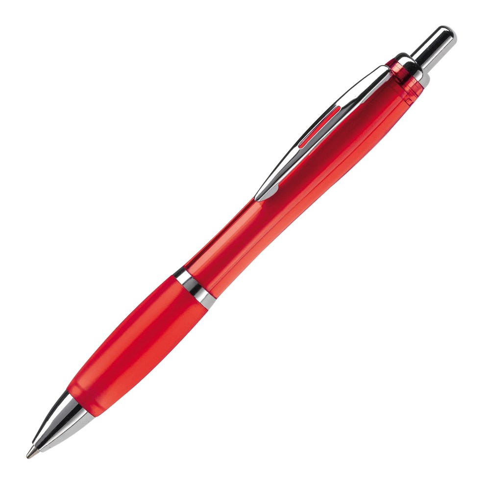 Transparante balpen met metalen clip, metal look drukknop, tussenring en penpunt. Blauwschrijvende Jumbo vulling. Vanaf 10.000 stuks andere schrijfkleur mogelijk.
