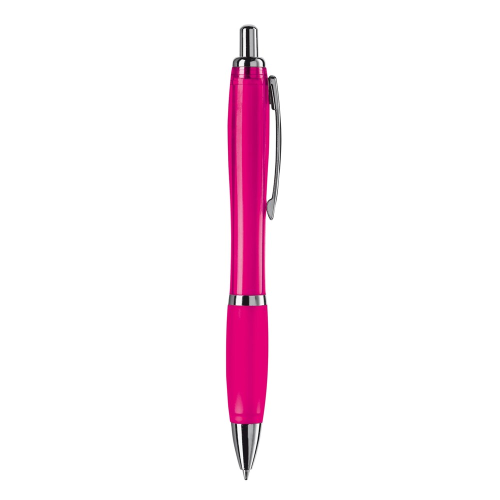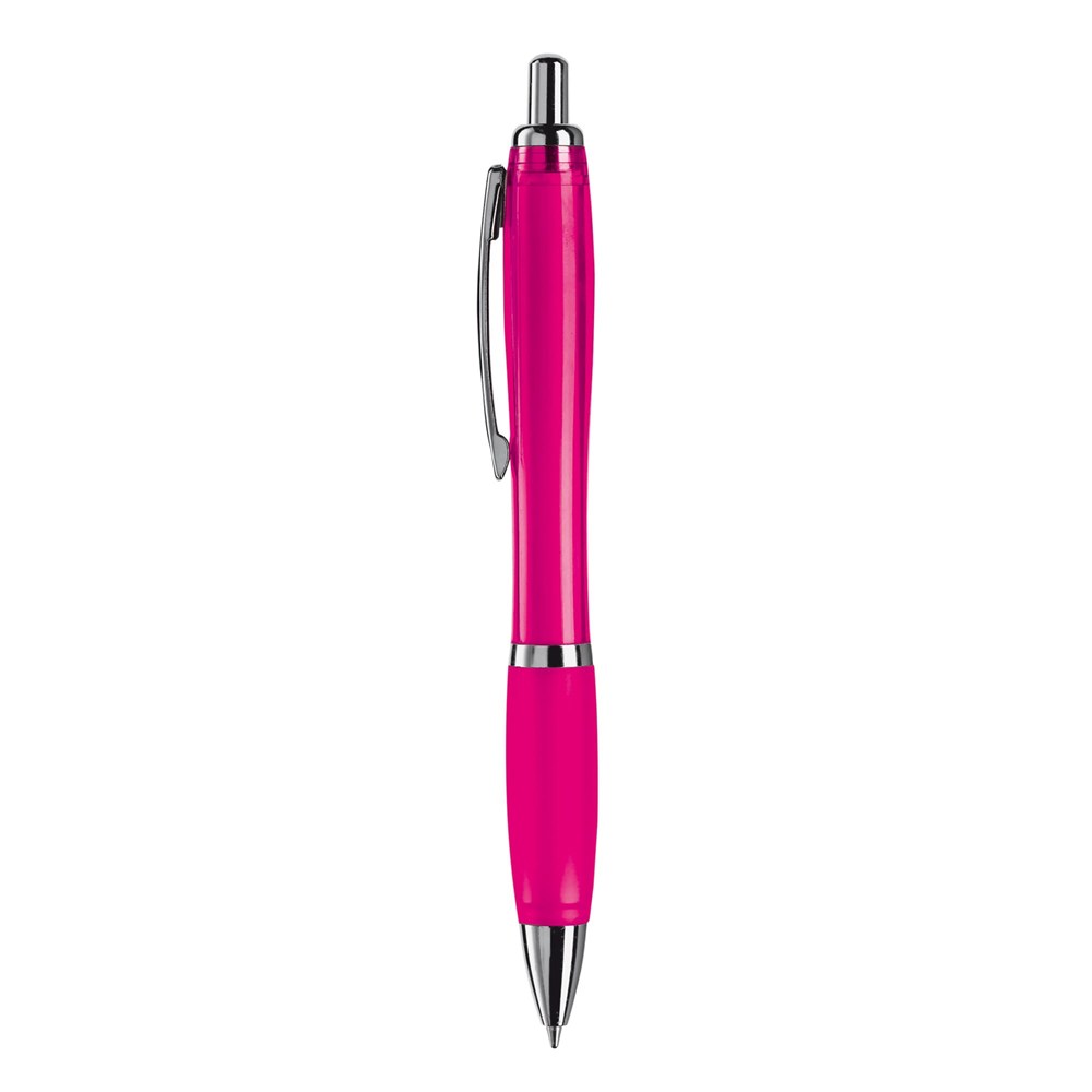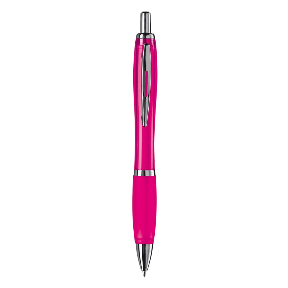 Transparante balpen met metalen clip, metal look drukknop, tussenring en penpunt. Blauwschrijvende Jumbo vulling. Vanaf 10.000 stuks andere schrijfkleur mogelijk.