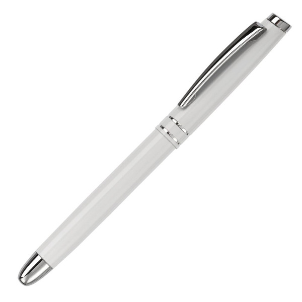 Blauwschrijvende aluminium rollerball pen met dop en twee strepen. Lasergravure mogelijk.