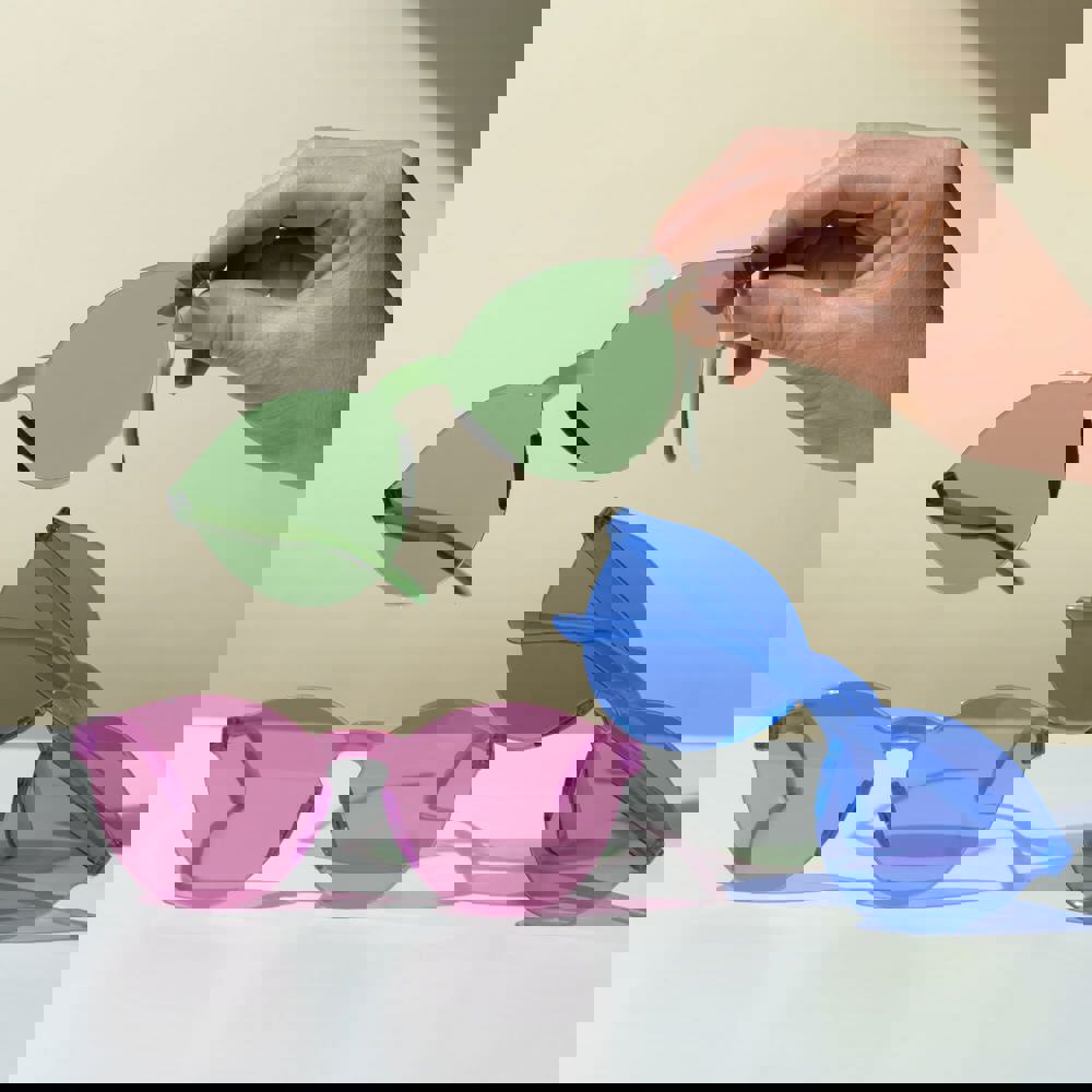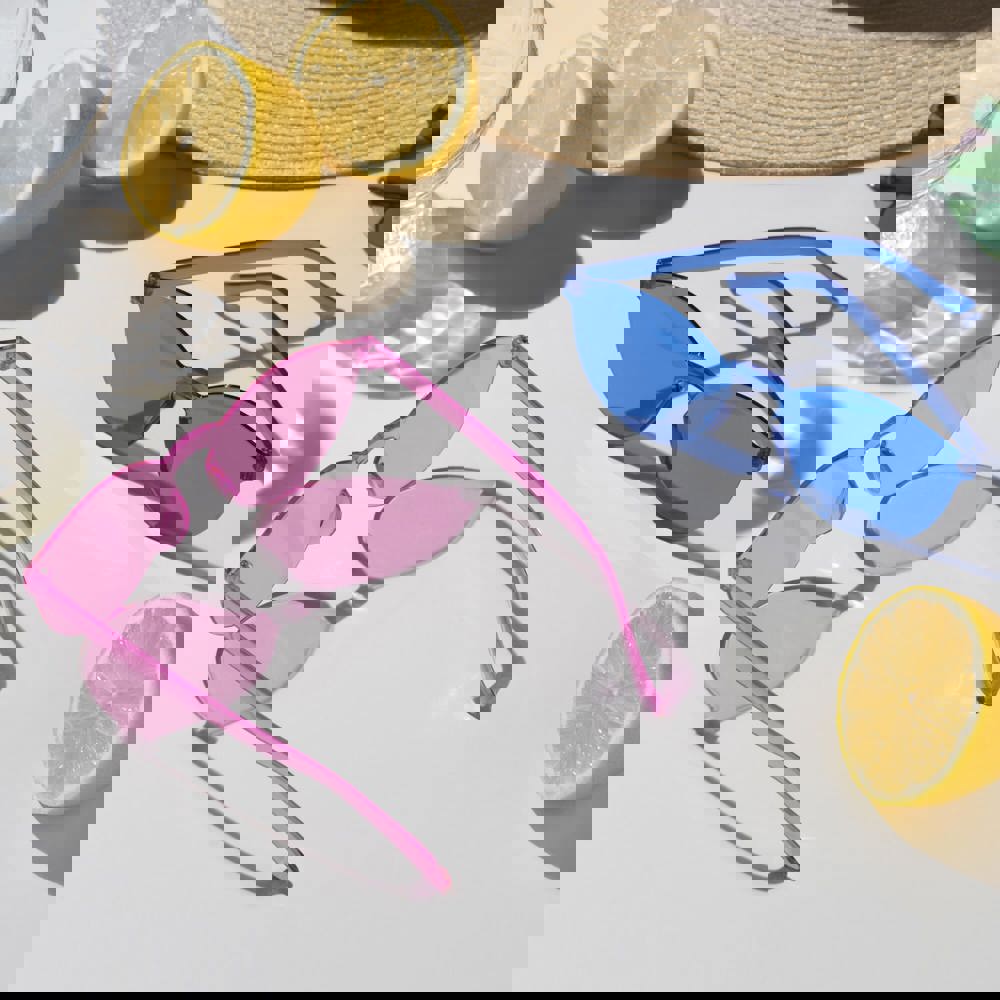 Vrolijke retrostijl zonnebril met uniform pastelkleurig frame en lenzen. De lenzen hebben een UV400 filter.