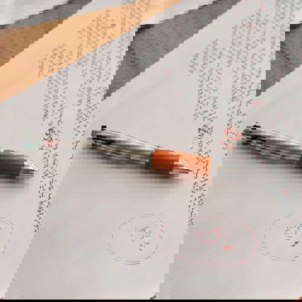 Witte, hardcolour balpen met vier schrijfkleuren en gekleurde grip.