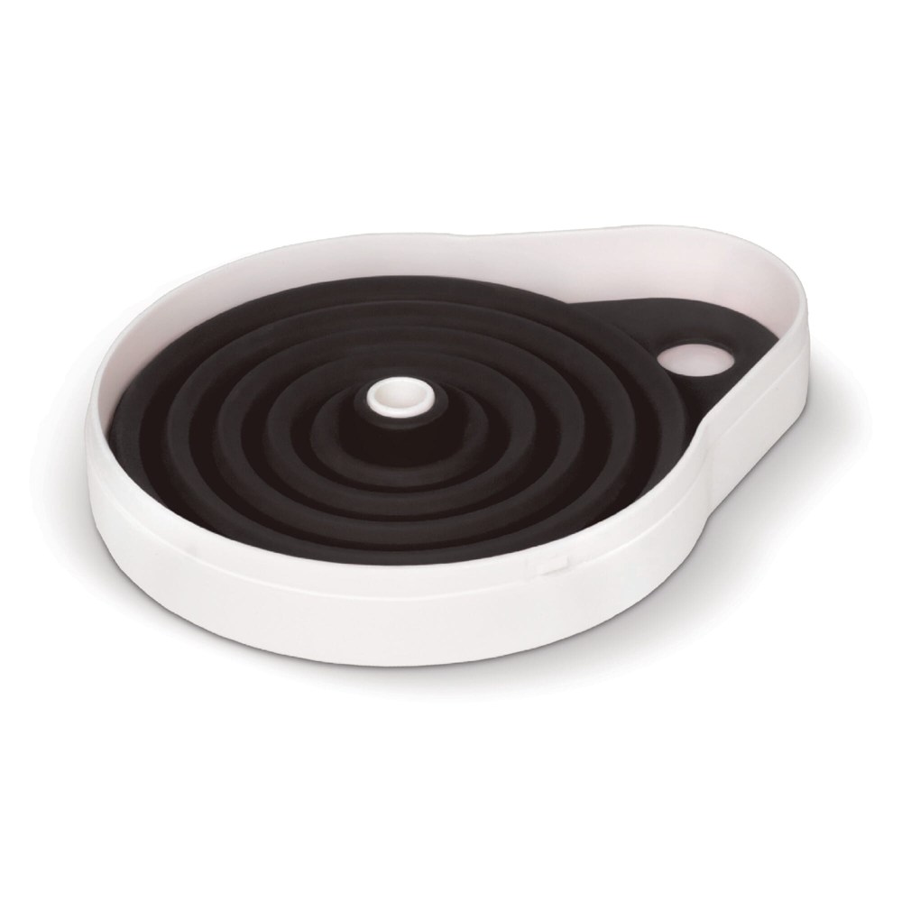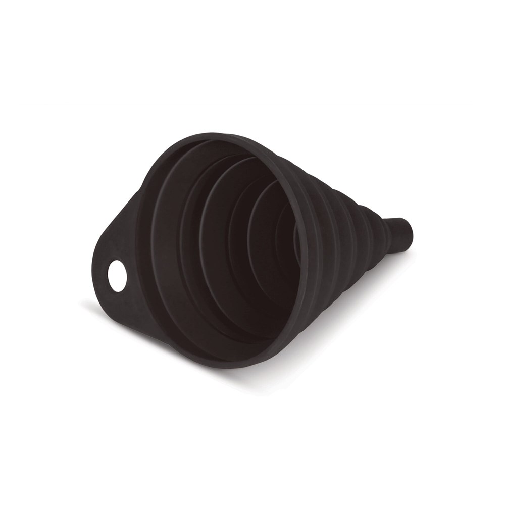 Uitvouwbare trechter voor bijvoorbeeld het bijvullen van de ruitenwisservloeistof in de auto. Kunststof houder met opvouwbare siliconen trechter. Bedrukking op de houder.