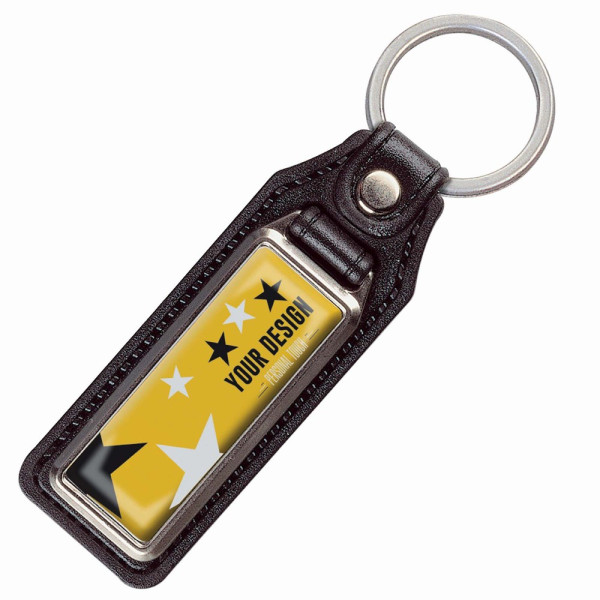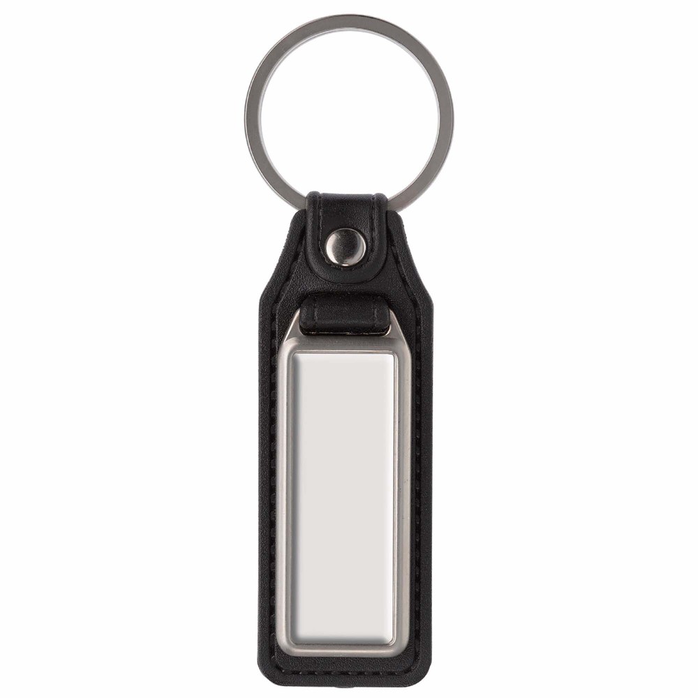Metalen rechthoekige sleutelhanger met ring. Met enkelzijdige doming.