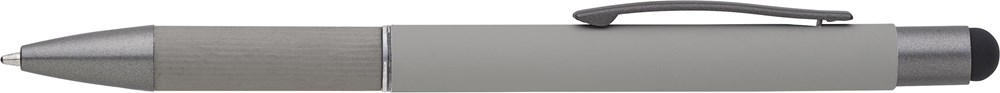 Aluminium balpen met gerold papier details op de grip. Rubberen tip voor capacitieve schermen....meer