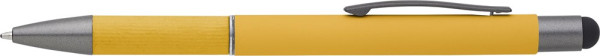 Aluminium balpen met gerold papier details op de grip. Rubberen tip voor capacitieve schermen. Blauwe inkt.