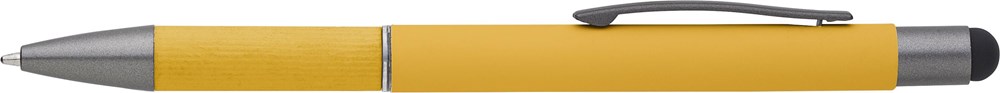 Aluminium balpen met gerold papier details op de grip. Rubberen tip voor capacitieve schermen....meer