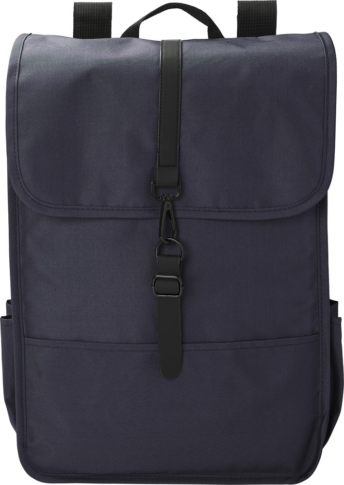 rPET polyester (300D) rugzak met flap. Twee flessenvakken aan de zijkant. Eén groot compartiment. Met zwarte PU band met sluitgesp.