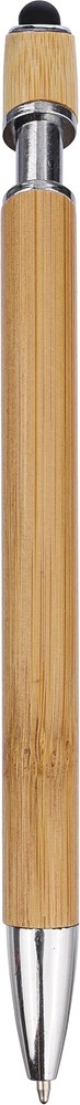 Bamboe balpen met chromen details. De punt is van plastic en de clip van metaal. Gekleurde stylus op de drukknop. Blauwe inkt.