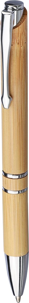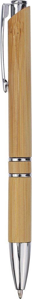 Bamboe balpen met chromen details. Ringen, drukknop en punt van plastic en clip van metaal. Zwarte inkt.