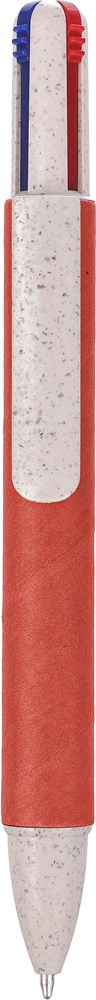 Gerecycled karton en tarwestro vierkleurenbalpen. Inktkleur vullingen: blauw, zwart, rood en groen.