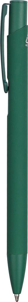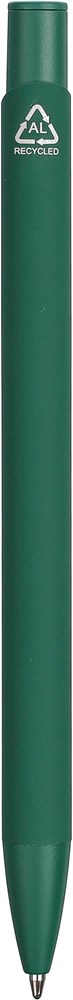 Gerecycled aluminium balpen met een rubberen coating op de houder. De clip, punt en drukknop zijn in bijpassende kleur. De clip is van metaal en de punt van plastic. Inclusief gegraveerd gerecycled aluminium logo. Blauwe inkt.