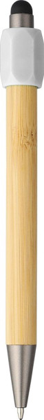 Bamboe balpen met spinnerfunctie, gemaakt van gerecycled ABS, en voorzien van een zwarte styluspunt op de drukknop. Uitgerust met een drukmechanisme, een 1,0 mm schrijfpunt en blauwe inkt met een schrijfafstand van ongeveer 800 meter. Inclusief een logo van gerecycled ABS.