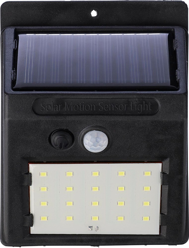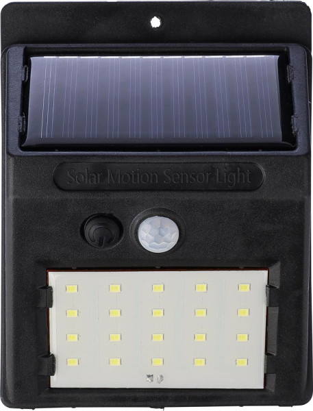 PP zonne-energie lamp met 20-COB LED. Voorzien van een nachtsensor (CDS) en een bewegingssensor (PIR). Inclusief een 800 mAh-batterij, een oplaadkabel, IP44-classificatie en een constante of knipperende lichtfunctie. Per stuk verpakt in een bruine kartonnen doos.