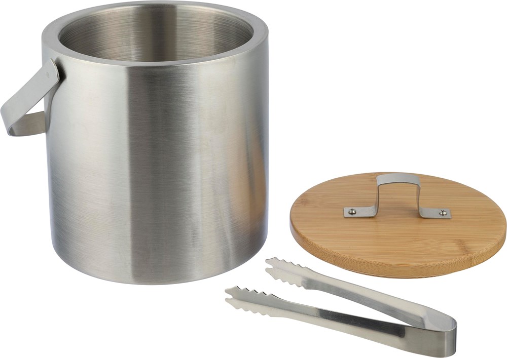Dubbelwandige roestvrijstalen ijsemmer met een bamboe deksel en een roestvrijstalen draaghandvat. De binnenkant is gemaakt van roestvrij staal 304 en de buitenkant van roestvrij staal 201. Inclusief ijstang en heeft een capaciteit van 1.200 ml. Per stuk verpakt in een bruine kartonnen doos.