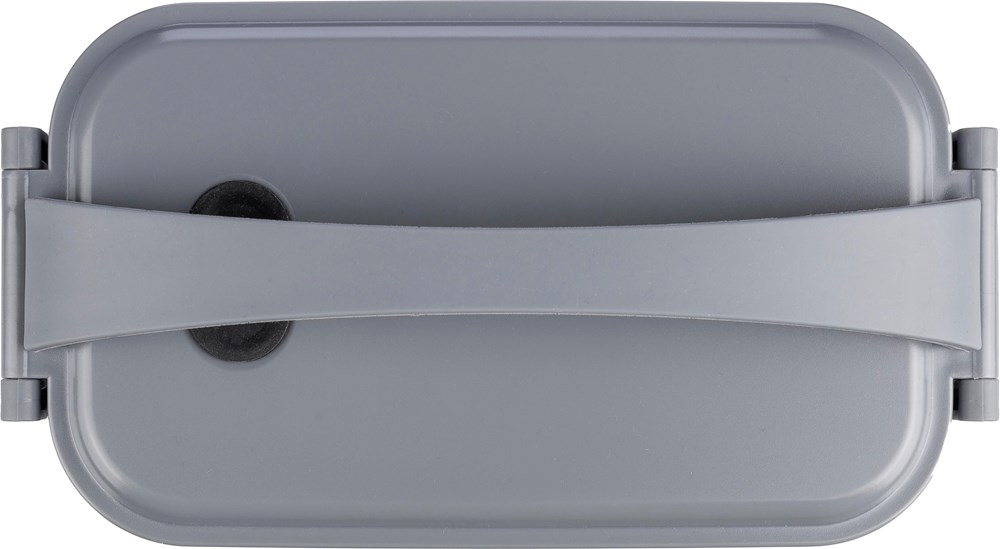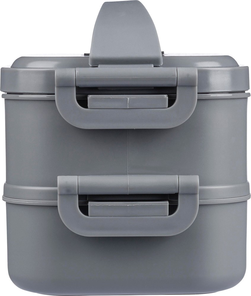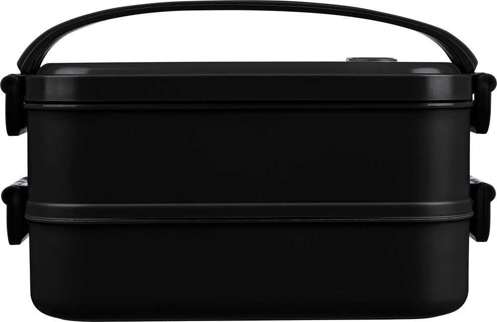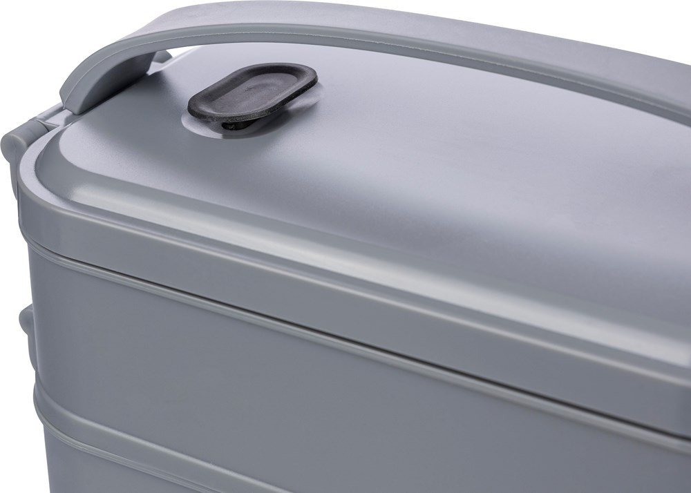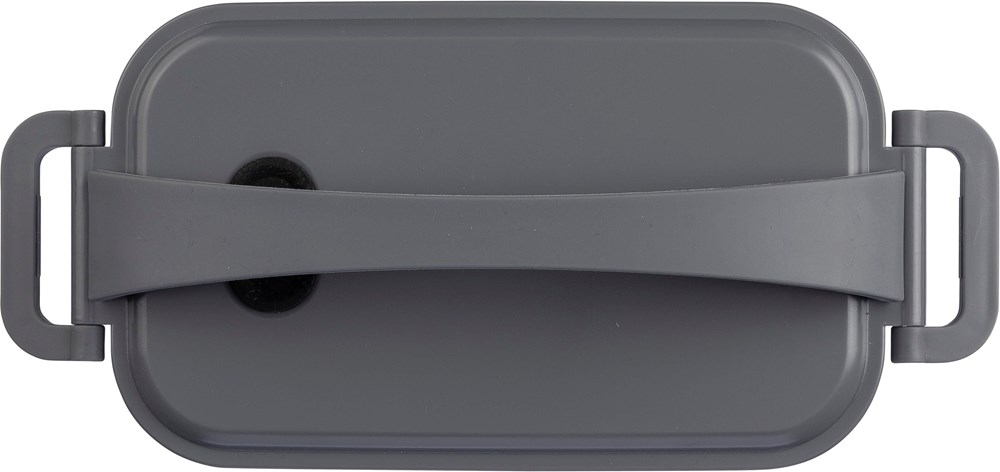 PP lunchbox met een totale capaciteit van 1.600 ml, verdeeld over twee lagen van 800 ml. Voorzien van een siliconen ventiel, geschikt voor gebruik in de magnetron, een gespsluiting en een siliconen draaggreep. Verpakt in bulk.