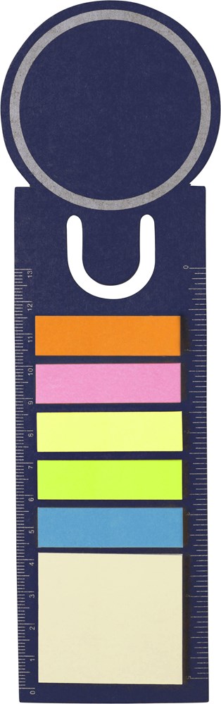 Kartonnen boekenlegger met zes verschillende zelfklevende memoblaadjes (16 stuks), en een voorgedrukte liniaal (cm en inch).