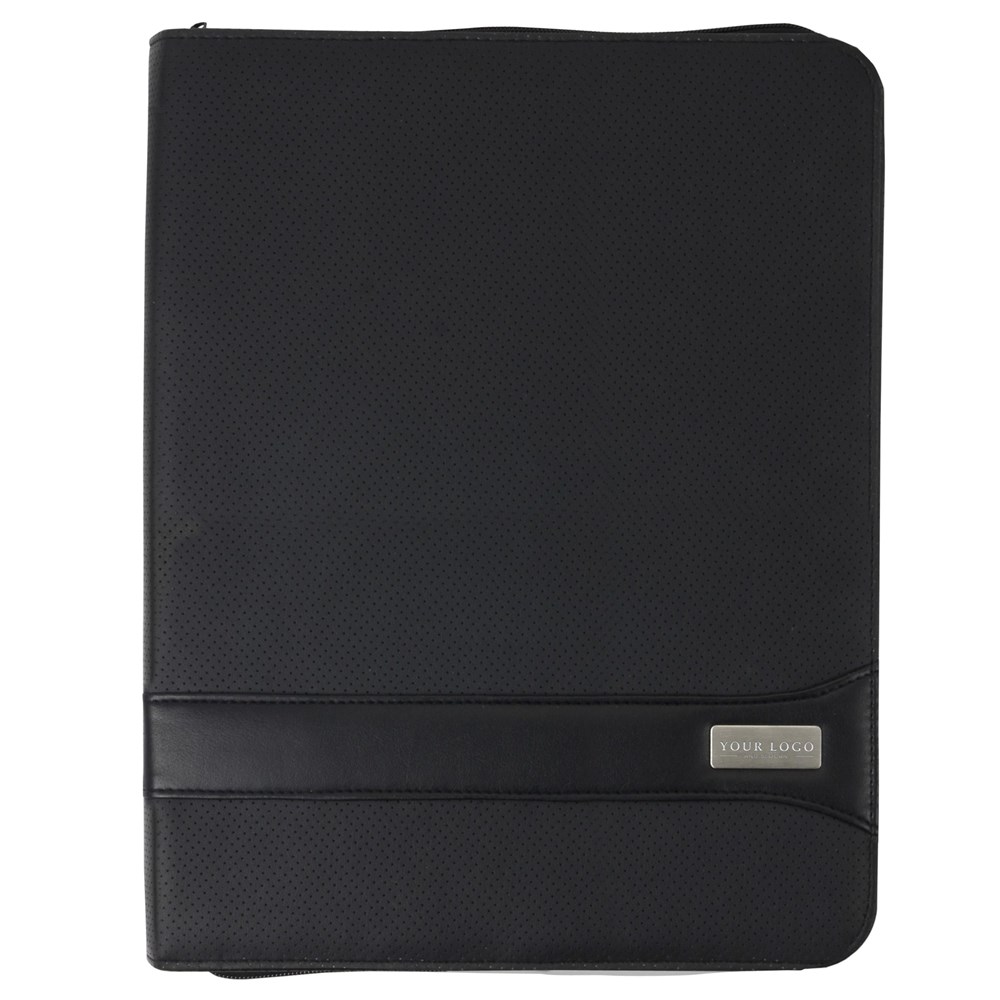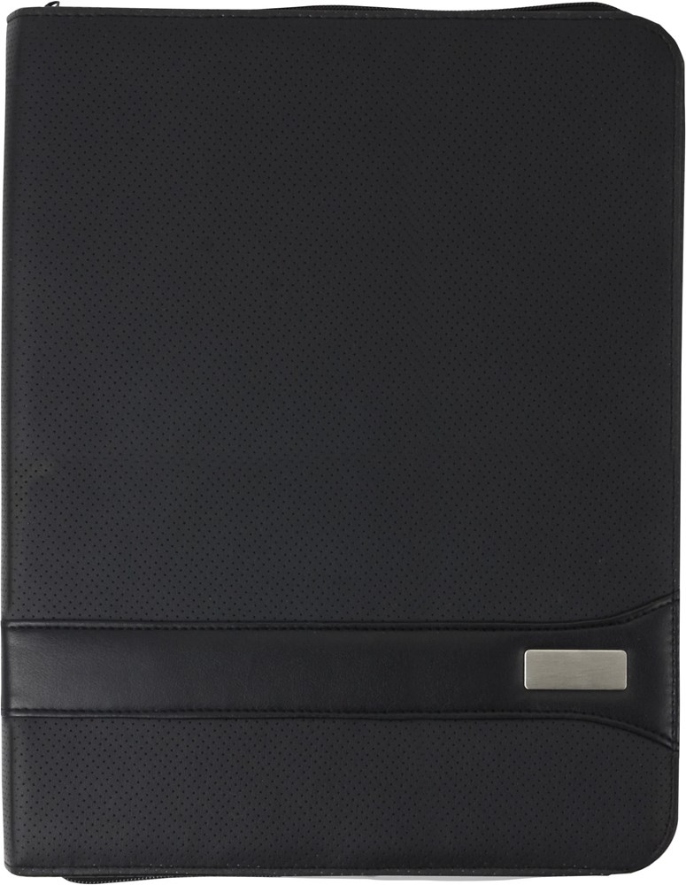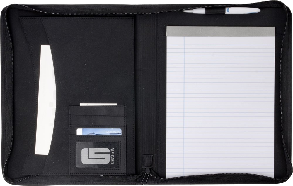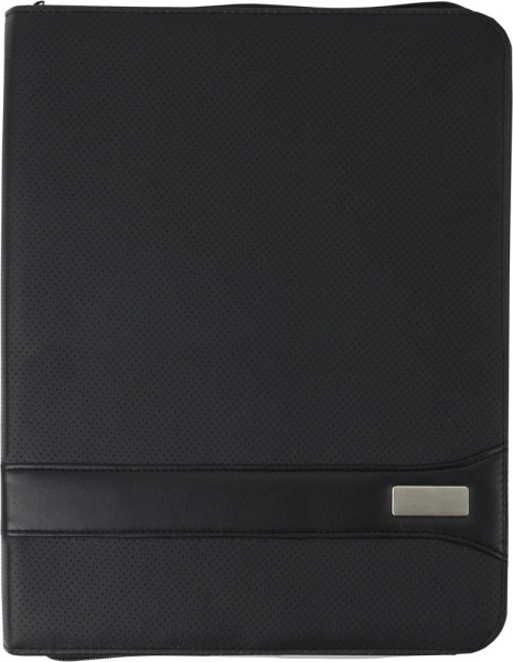 PVC documentenmap 'geperforeerd' (A4) met ritssluiting en met twee grote en vier kleine insteekvakken en penlus. Deze map wordt geleverd incl. gelinieerd schrijfblok (30 vel).