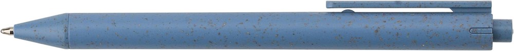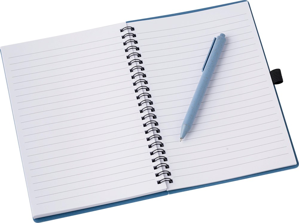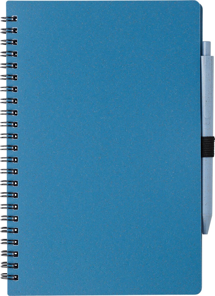 Notitieboekje met tarwestro en PP kaft en tarwestro pen, blauwe inkt, in penlus. Notitieboekje heeft 70 gelinieerde vellen. Ongeveer A5-formaat.