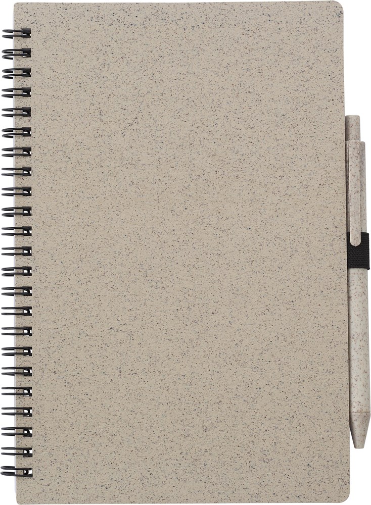 Notitieboekje met tarwestro en PP kaft en tarwestro pen, blauwe inkt, in penlus. Notitieboekje heeft 70 gelinieerde vellen. Ongeveer A5-formaat.