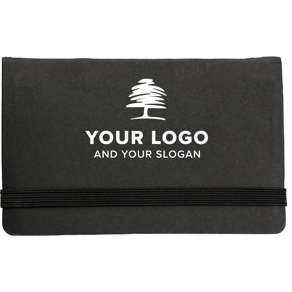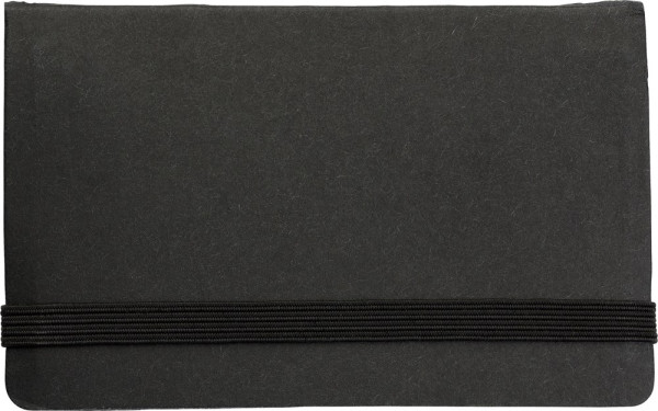 Kartonnen memoboekje met ca. 150 zelfklevende memoblaadjes en visitekaarthouder in de omslag. Sluiting door middel van elastieken band.